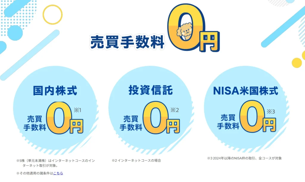 国内株の売買手数料0円(所定条件)と、NISAでの米国株・海外ETF手数料0円(為替等別)で、コストを抑えて分散投資を進めたい方の資産形成を後押しします。