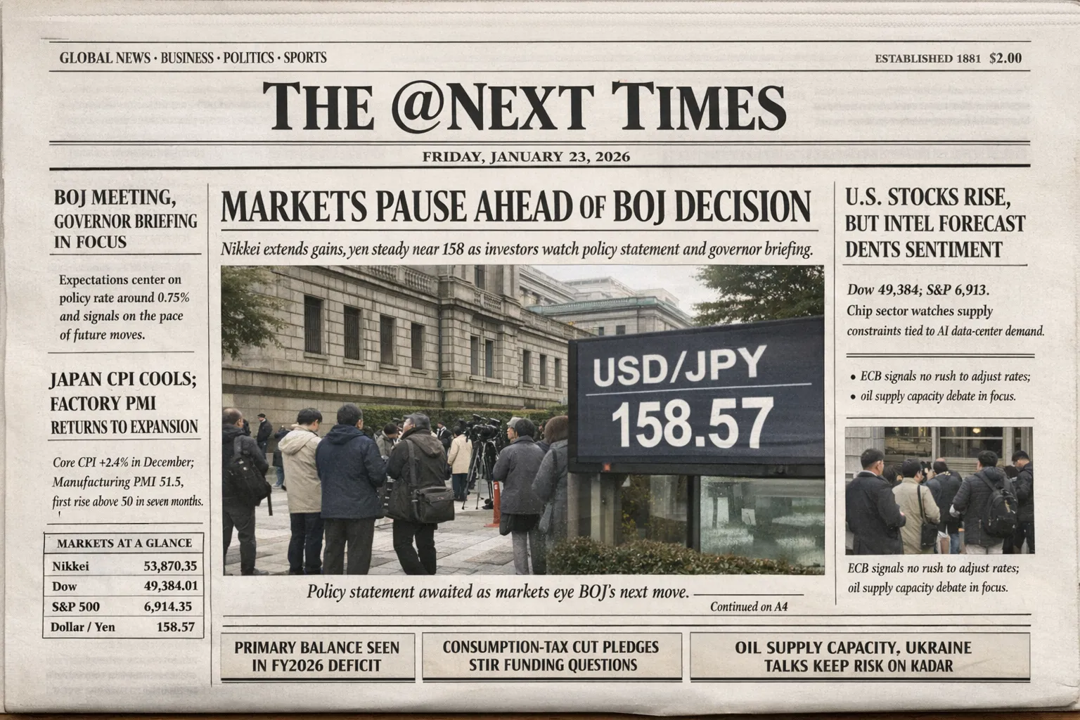 2026年1月23日は、日銀会合の結果発表と総裁会見を控え、株式と為替が様子見ムードです。