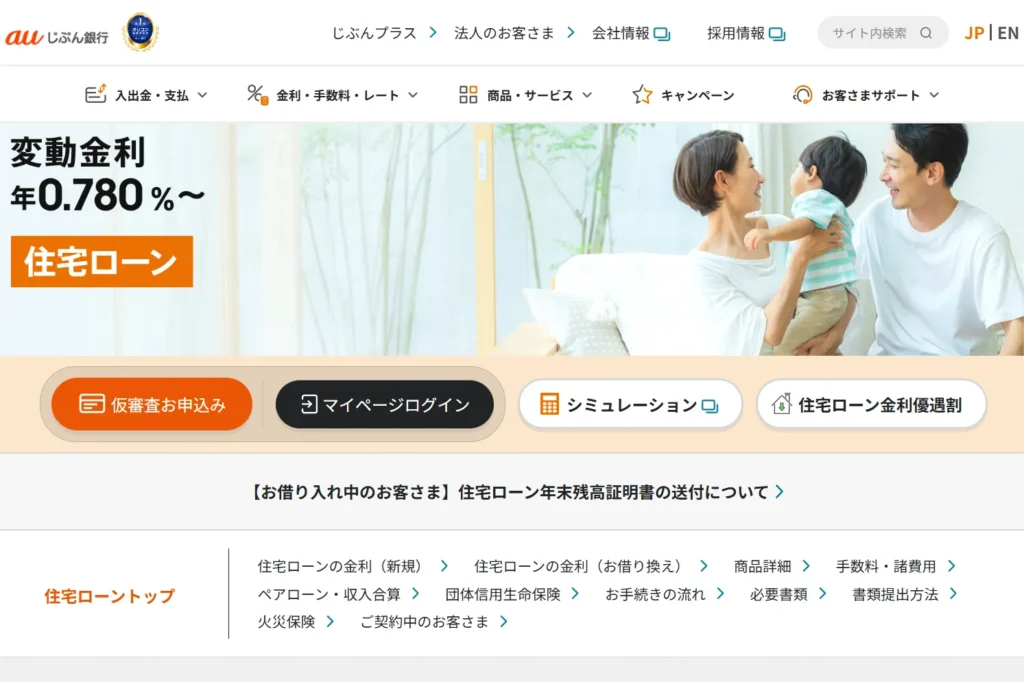毎月のスマホ料金などとの連携による優遇割が特徴で、特にau利用者なら金利優遇※やPontaポイント特典があるため、「携帯もau、住宅ローンもauじぶん銀行でまとめたい」方に適しています。