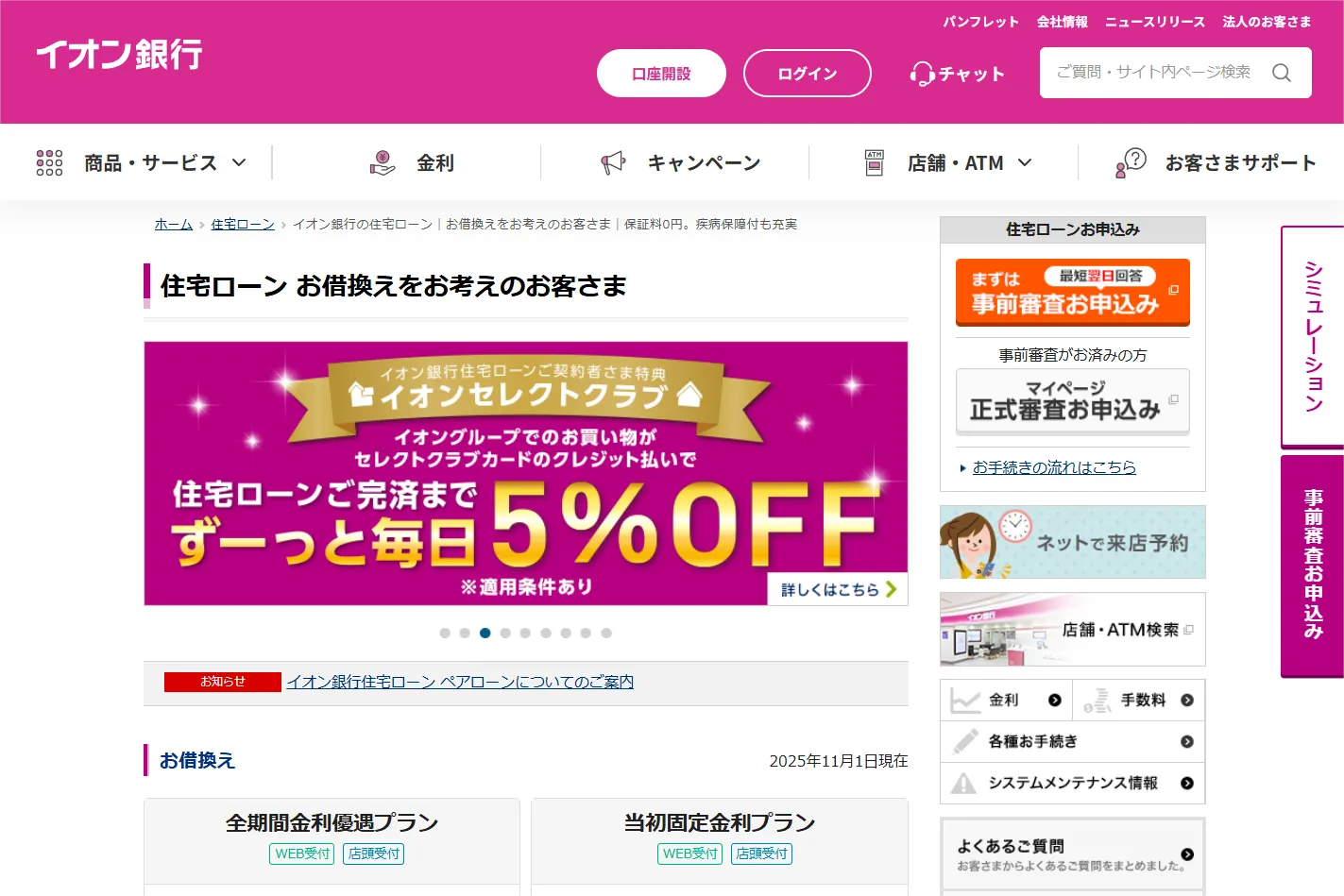 ※各商品の最新の適用金利・手数料・付帯条件は、契約時点で変動します。申込み前に必ずイオン銀行公式サイトの商品概要説明書をご確認ください。フラット35の借入期間は原則として最長35年で、選択する返済期間に応じて金利が適用されます。