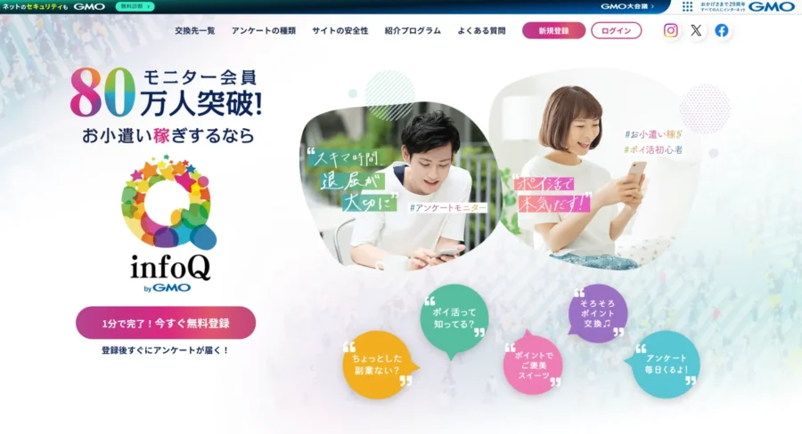 大手アンケートサイトの「infoQ(インフォキュー)」は、アンケート回答を中心にスキマ時間にコツコツポイントを貯めたい人向けのサービス。