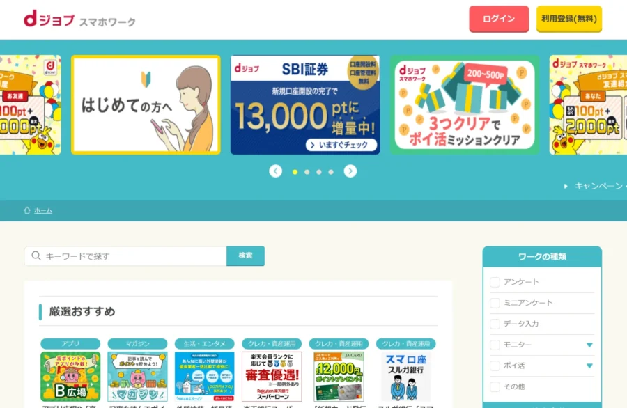 より「お仕事」に近い形で稼ぎたい方には、NTTドコモが運営する在宅ワークサービス「dジョブスマホワーク」も代表的です。